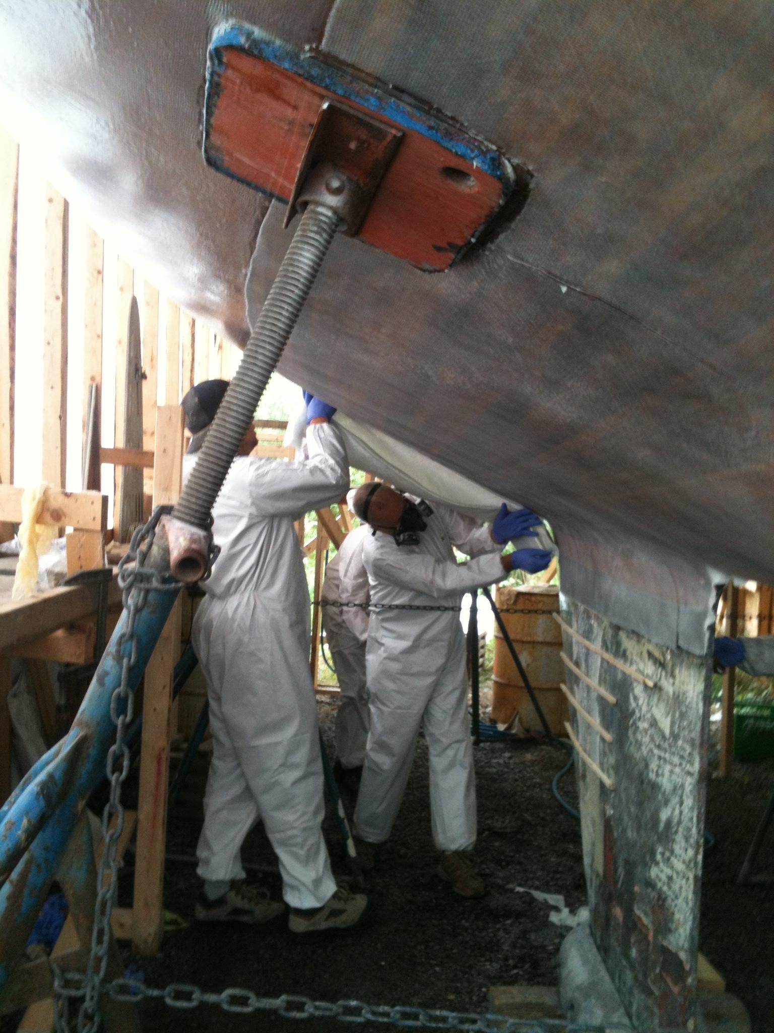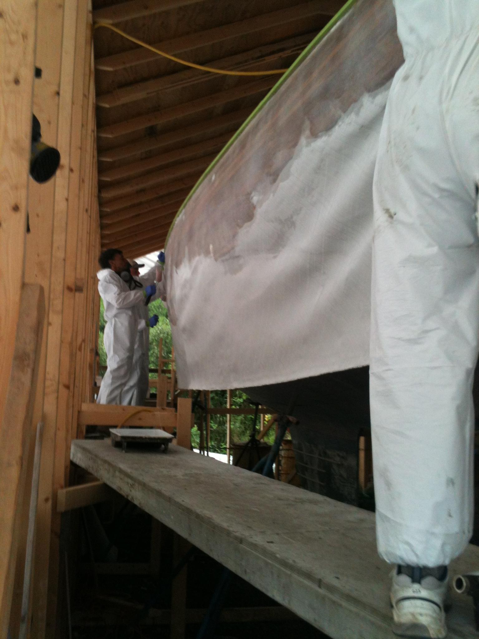 The crew from Jespersen Boat Builders glues 9 ounce glass cloth with West System 105+206 epoxy in one 36 foot piece