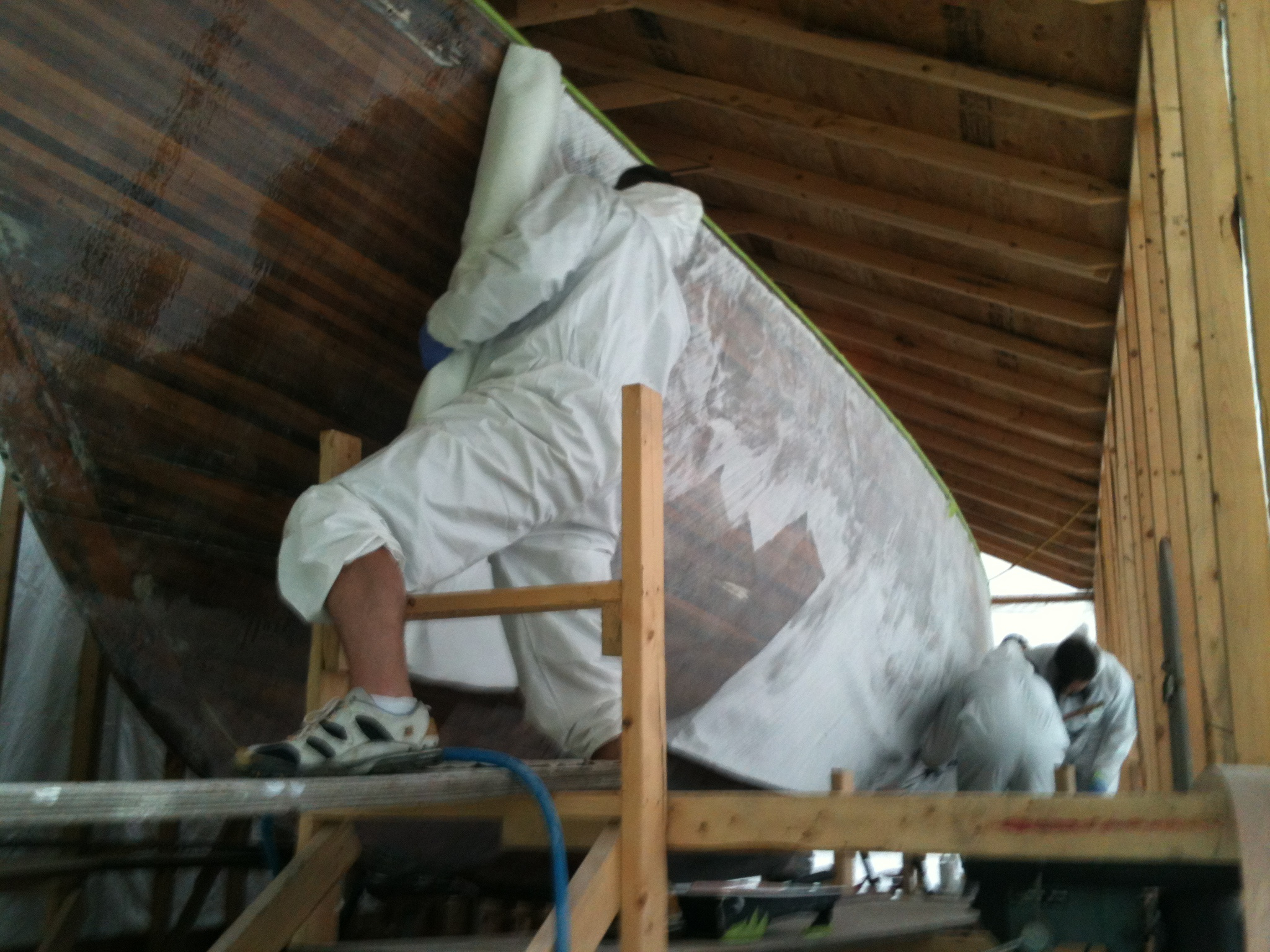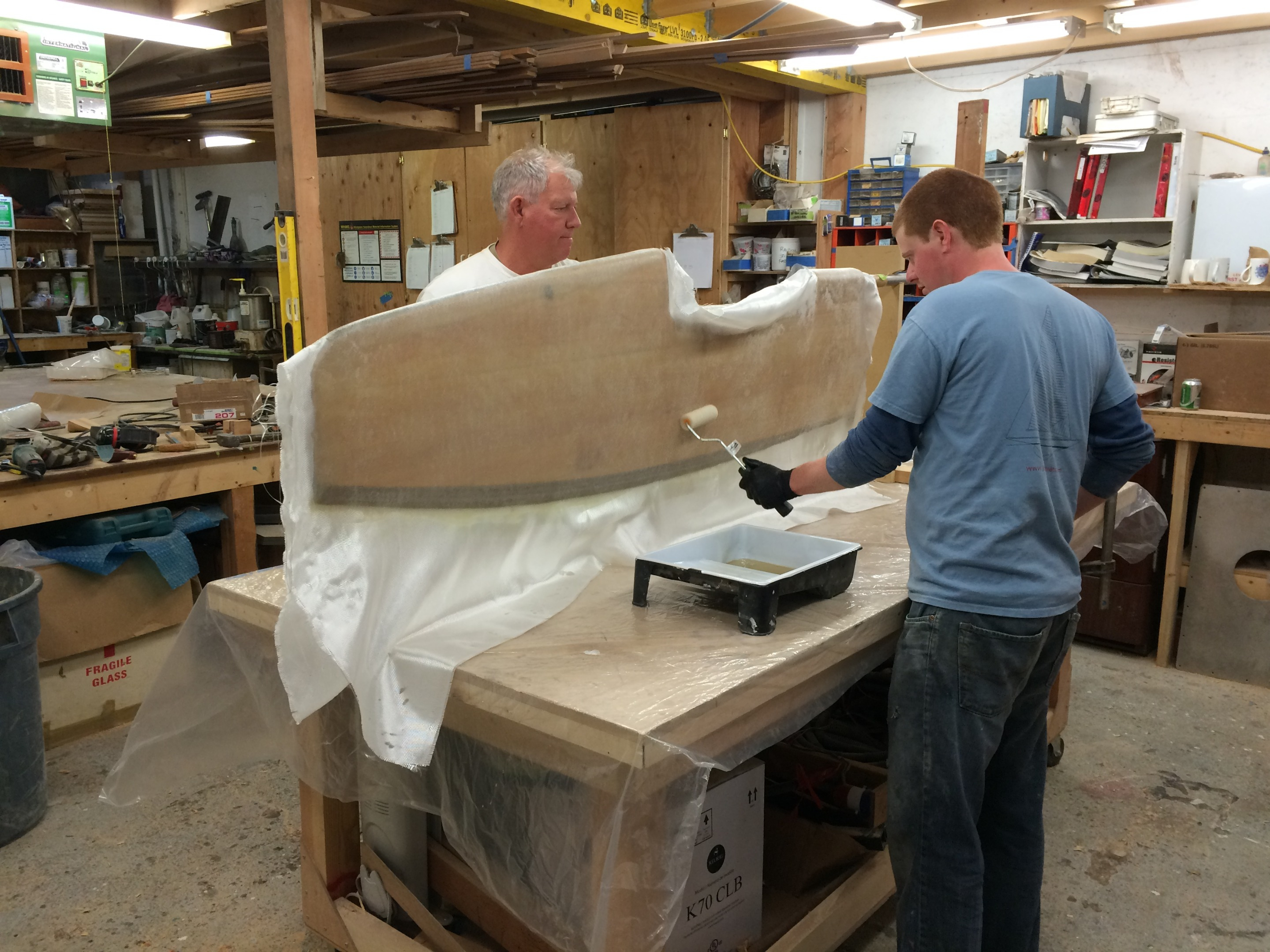 The crew from Jespersen Boat Builders glues 9 ounce glass cloth with West System 105+206 epoxy in one 36 foot piece
