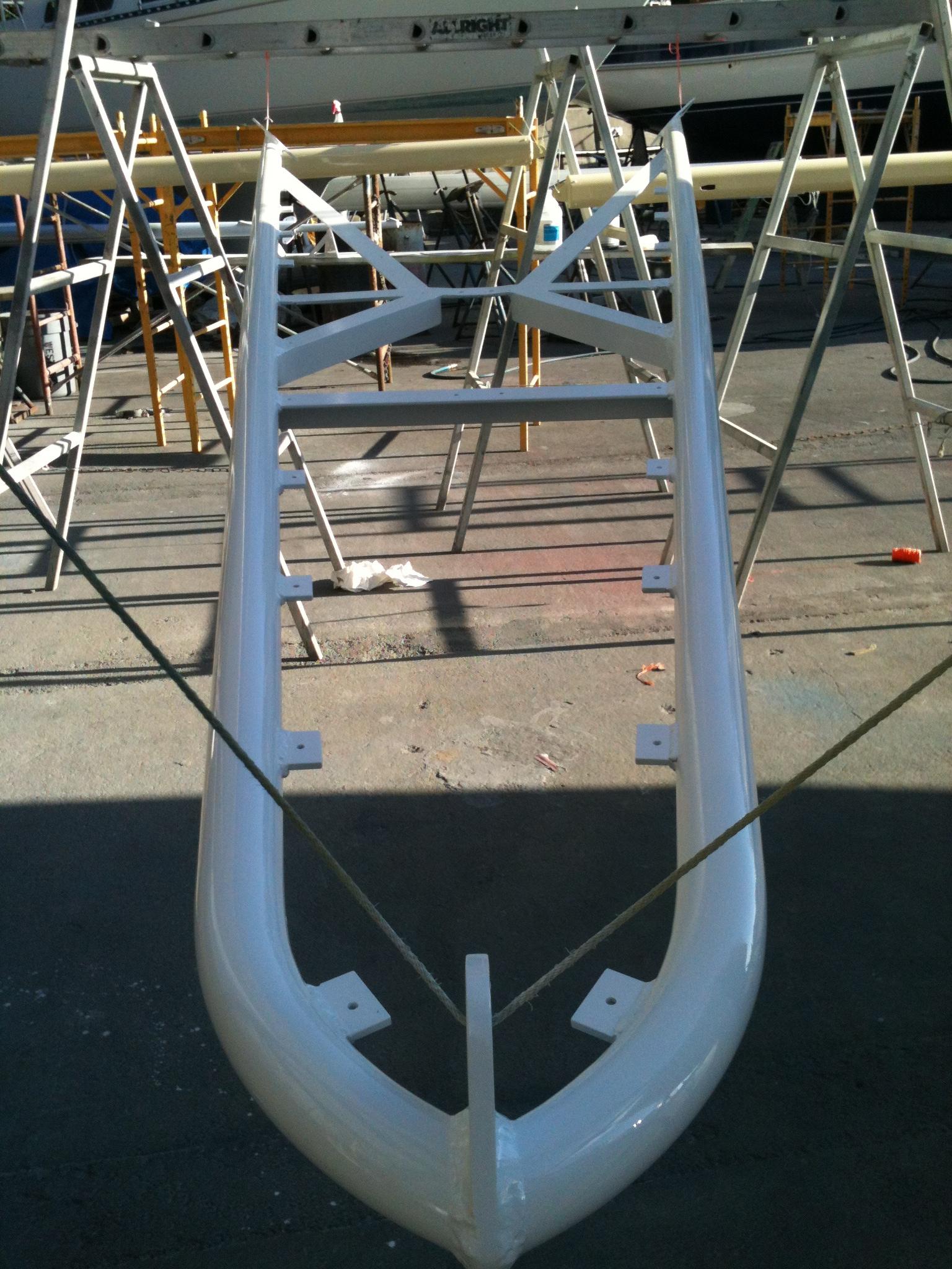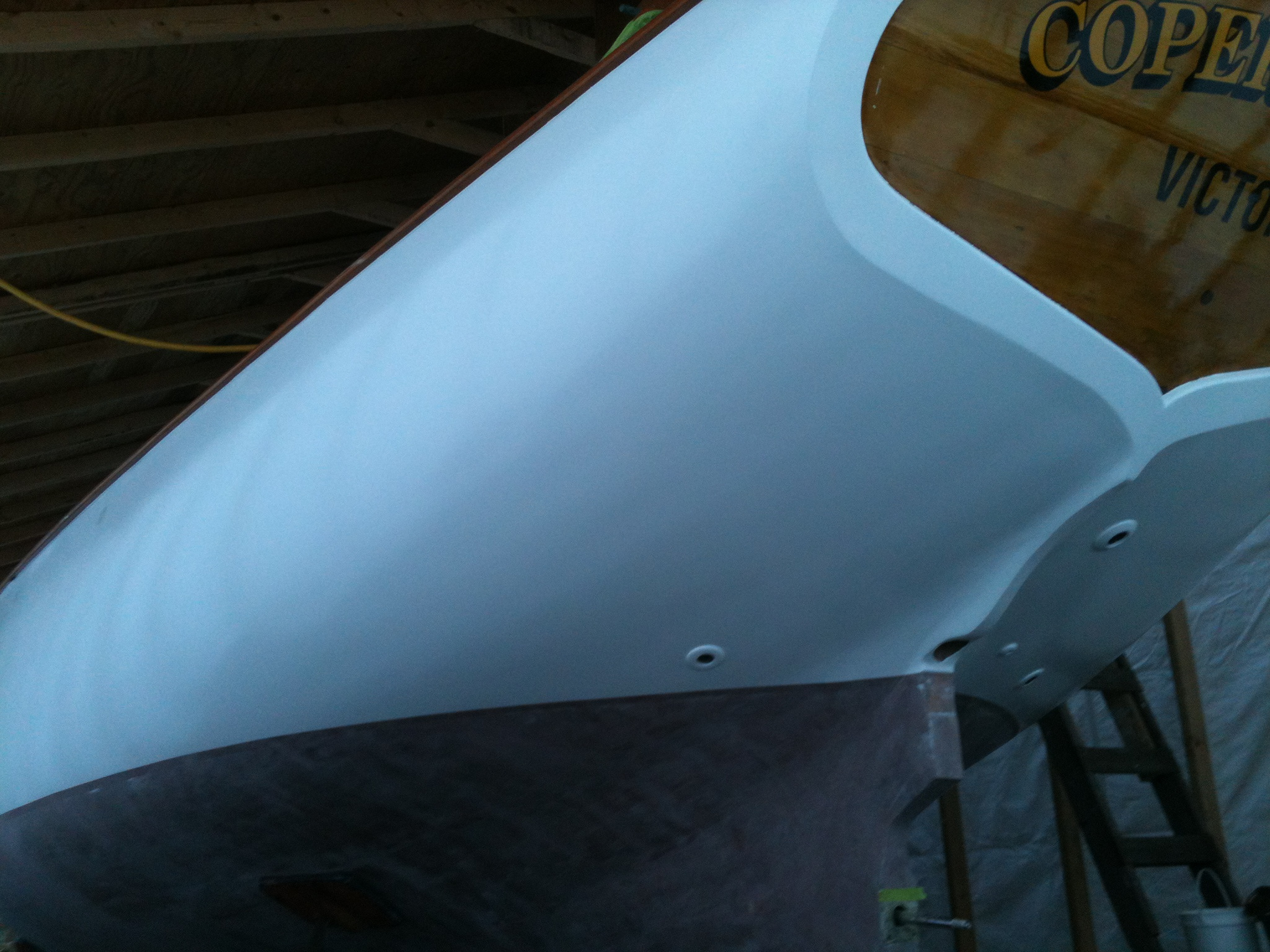 All glassed and faired with epoxy mixed with West System 407 low density filler, sanded and ready for paint